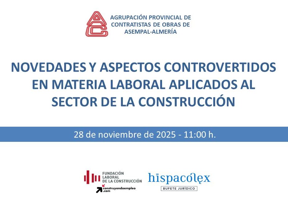 La Agrupación Provincial de Contratistas de Obras de ASEMPAL-Almería organiza, en colaboración con la Fundación Laboral de la Construcción (FLC), el próximo viernes 28 de noviembre, a las 11:00 horas, en la sede ASEMPAL (Avda. Cabo de Gata, 29 – 1ª planta), la Jornada “Novedades y aspectos controvertidos en materia laboral aplicados al sector de la construcción”.